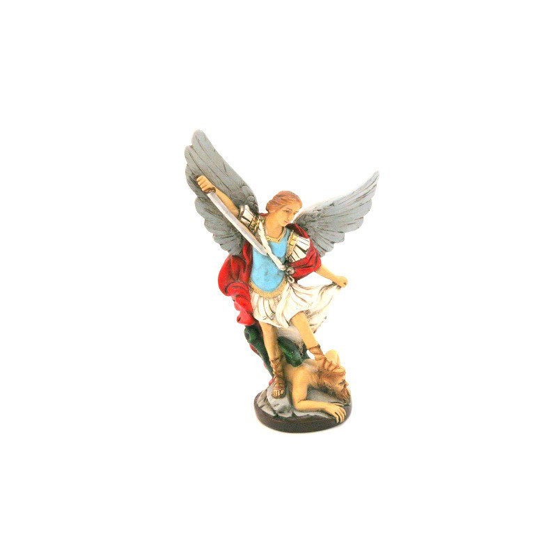 Statue religieuse de Saint Michel, en résine décorée. Sa hauteur est de 16 cm. Les finitions de cette statue de l'archange St Michel sont faites à la main à la peinture. La résine présente l'avantage d'être un materiau beaucoup plus solide que le plâtre. L' utilisation de cette statue religieuse de Saint Michel est recommandée pour l'intérieur.