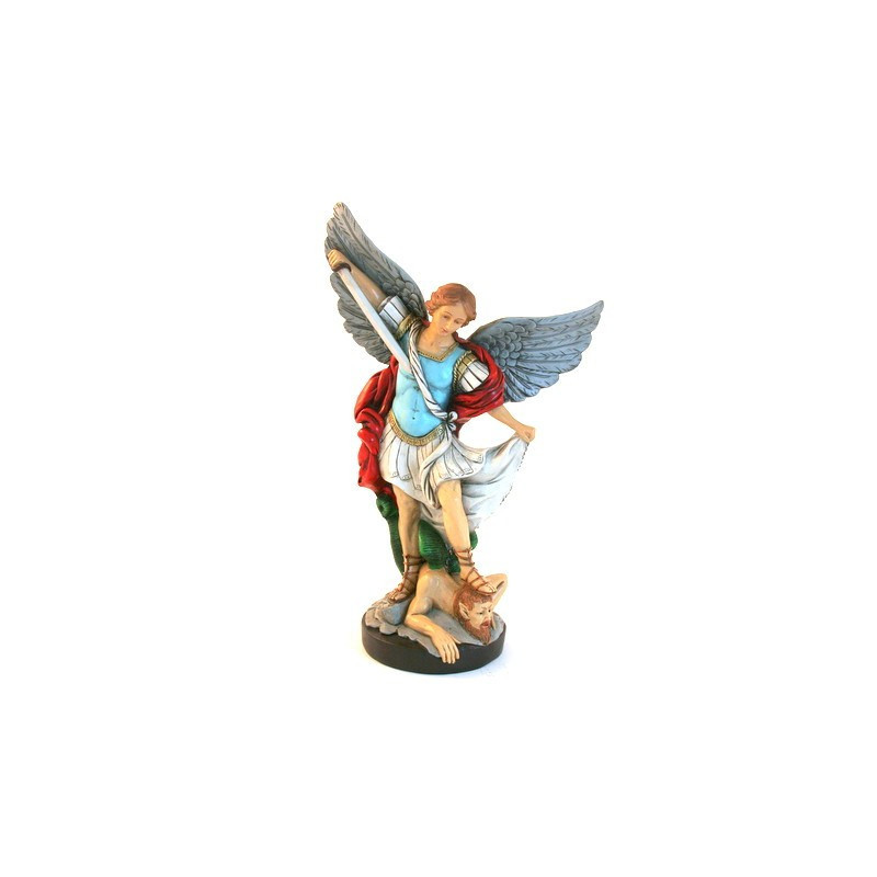 Statue religieuse de Saint Michel, en résine décorée. Sa hauteur est de 30 cm. Les finitions sont faites à la main à la peinture. La résine présente l'avantage d'être un materiau beaucoup plus solide que le plâtre. Son utilisation est recommandée pour l'intérieur.